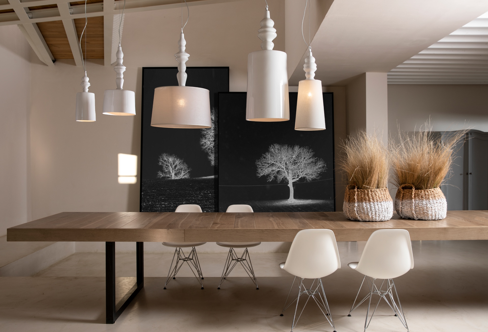 Sculptures of light. Hand-blown Murano-style glass from Melogranoblu alongside iconic Italian fixtures — each piece chosen for the drawing it makes in a room.